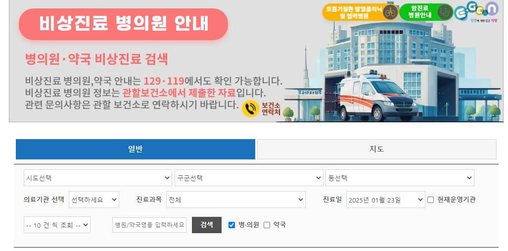 - 응급의료포털 사이트 : 연휴 응급진료 병원 및 약국 리스트를 실시간으로 검색할 수 있습니다.