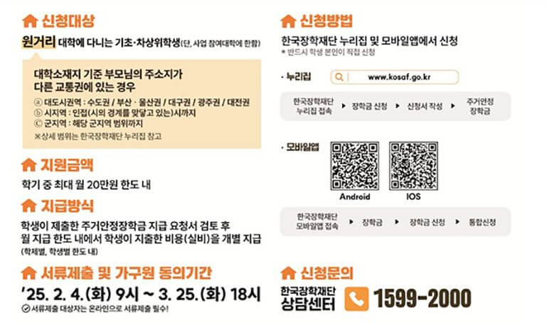 - 지원 가능 대학 소속 : 2025학년도 주거안정장학금 사업에 참여하는 대학 재학생