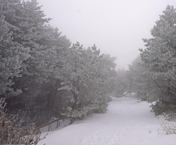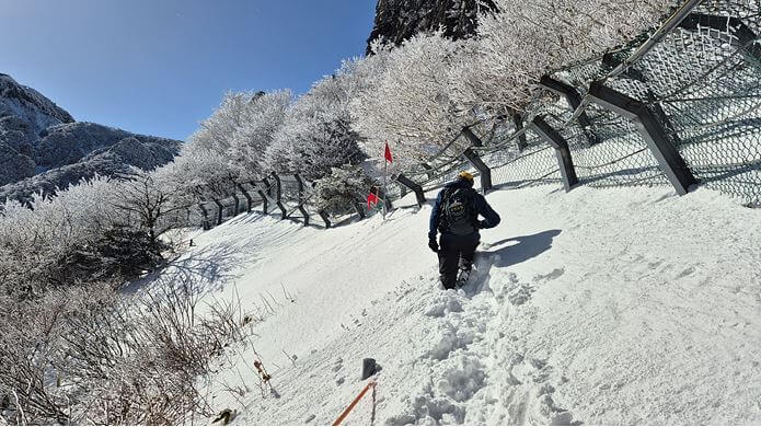 겨울에는 설경으로 덮인 한라산이 압도적인 아름다움을 자랑합니다. 그러나 눈이 쌓여 길이 미끄러울 수 있으니 아이젠 등 겨울 장비를 꼭 준비하세요.