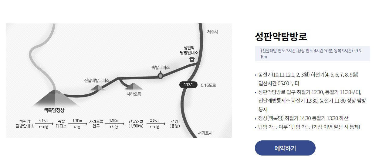 - 성판악 코스: 총 길이 9.6km, 정상까지 약 4시간 30분 소요