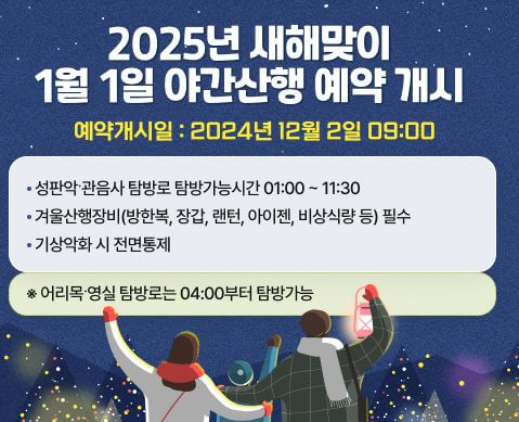 ** 2025년 새해맞이 1월 1일 야간산행 예약도 가능하니 멋진 계획을 준비 중이라면 확인해 보세요!!