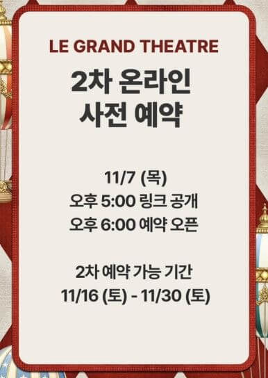 2차 예약은 11월 7일(목) 오후 6시에 오픈됩니다. 예약은 11월 16일(토) ~ 11월 30일(토) 기간 동안 진행되며,