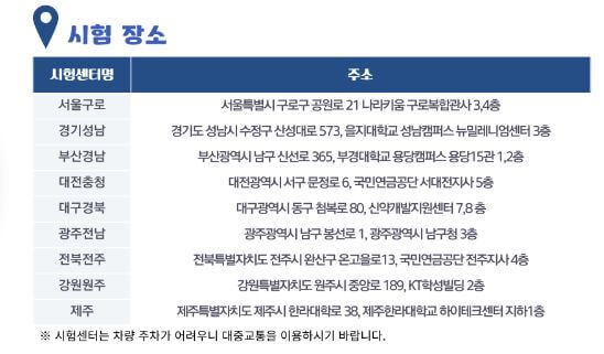 시험장소는 지역별로 다르며, 각 지역의 시험센터는 아래와 같습니다.