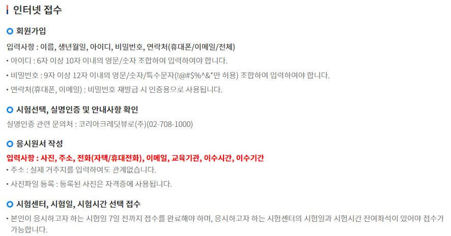 - 응시원서 접수 시 현재 거주지를 도로명 주소로 정확히 기재해야 하며, 접수 기간 내에 응시수수료 32,000원을 결제해야 접수가 완료됩니다.