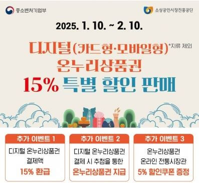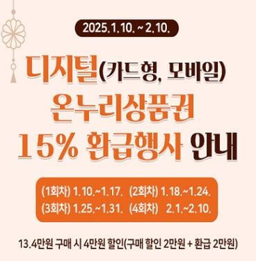 - 디지털 온누리상품권 환급 이벤트: 구매 금액의 15%를 적립 (1인당 최대 2만 원 한도).
