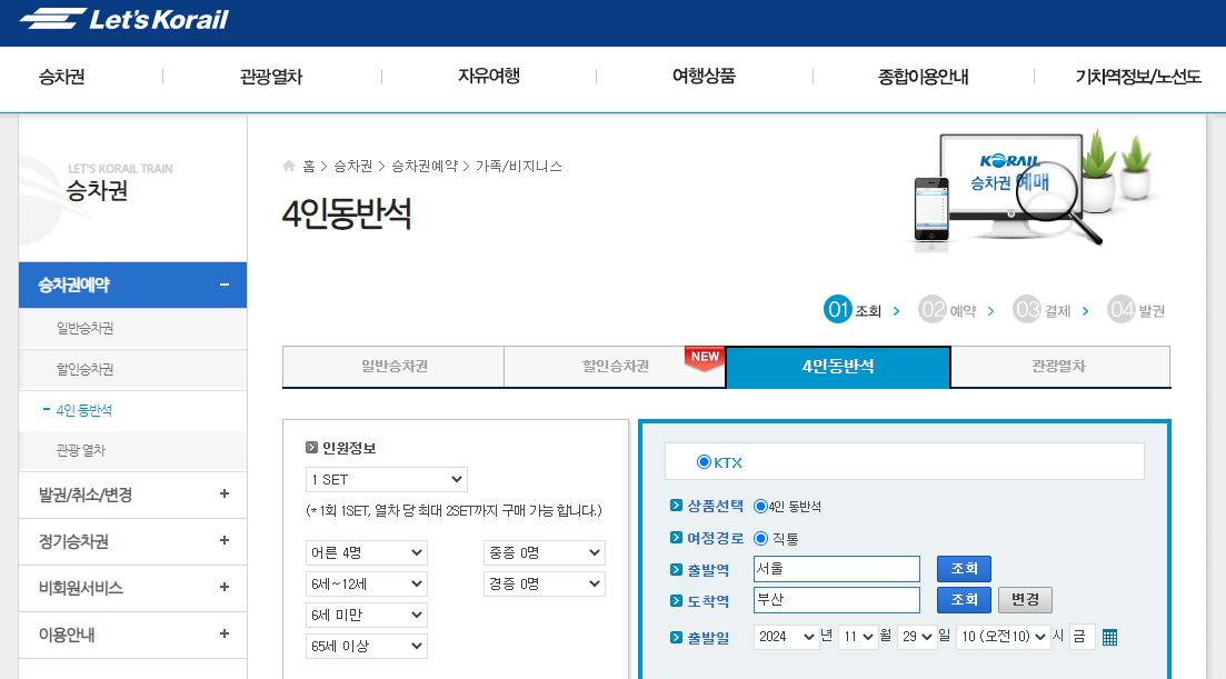 3, 좌석 선택 | 조회된 열차 목록에서 4인 동반석 옵션을 선택합니다. |